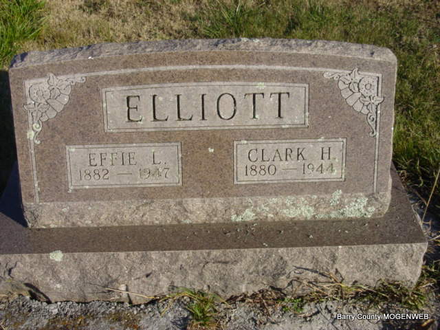 SSW: Effie L. - Research Note: His death certificate reads that he was a farmer. His father was Clark Elliott, born VT, and his mother was Jane Watkins, born VT, and Effie Elliott was his wife. He had lived most of his life in Barry County. The cause of death was apoplexy. Mrs. Effie Elliott, Cassville, MO, was the informant. | Death Certificate Donna Cooper Photo Ted Roller |
