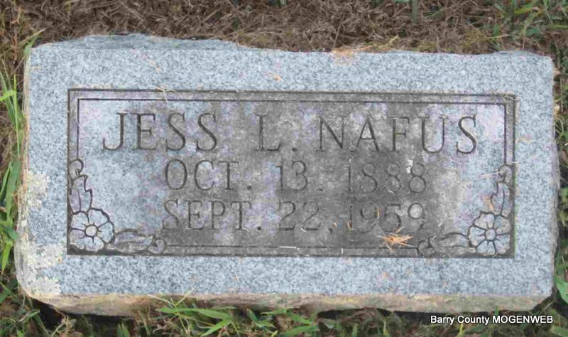 | NAFUS, Jess Lee | Oct. 13, 1888 | Sept. 22, 1959 | Research Note: Son of Thomas Benton Nafus and Josephine Weldy. Jesse Lee Nafus age 22, married Cora Mae Gamble, age 19, on June 24, 1911 in Ottawa Co., OK. She died 1927 and is buried in Miami, Ottawa Co., OK. Jess L. Nafus married Nellie Nafus on Apr. 19, 1939 in Neosho, Newton Co., MO. Both were from Ottawa Co., OK. - October 14, 1915, Thursday, Cassville Republican - Oak Ridge News: Jess Nafus and family were visiting his brother, Emmet, Friday. - September 8, 1917, Saturday, Cassville Democrat - Jess Nafus and family of Commerce, Okla., are visiting his parents Mr. and Mrs. T. B. Nafus and family of near this city. | SS Claims Index Online Newspapers OK Marriage Index MO Marriage Records Phyllis Long Photo Elmer Thorn |