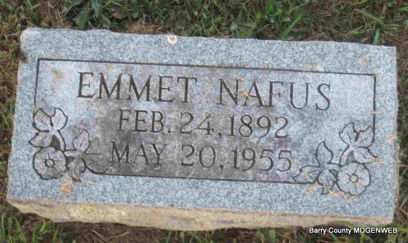 Research Note: His death certificate states that he was born Feb. 24, 1891 and not 1892 as his stone reads. His father was listed as Thomas Benton Nafus and his mother's name was given as Josephine Weldy. Tensie Payne was given as his wife's name and he was divorced. Mrs. Earl Vaughn of Cassville, MO, gave the information. Tensie died in 1990 and is buried at Albuquerque, NM. - Emmett Nafus, age 23, married Tensie Payne, age 20, on Apr. 18, 1915 in Barry Co., MO. - April 29, 1915, Thursday, Cassville Republican - Cross Hollows News: We learn that Emmett Nafus and Miss Tensie (Tennessee) Payne were married Sunday. We wish them long and happy life. - May 15, 1920, Cassville Democrat - Emmett Nafus, Harve Lowe and wives spent Sunday at the Andrew Nafus home. | Death Certificate Donna Cooper Online Newspapers MO Marriage Records Phyllis Long Photo Elmer Thorn |