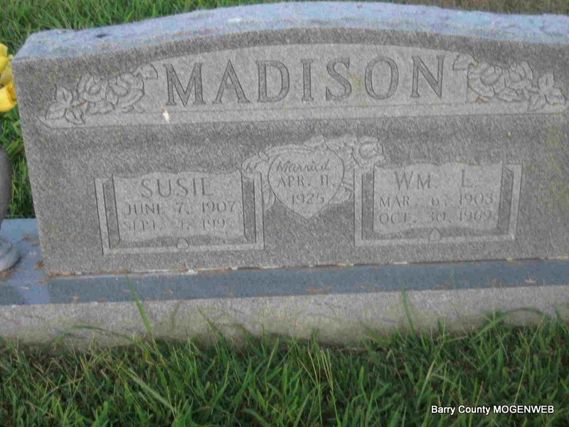 SSW: Susie - Inscription: "Married April 11, 1925" - Research Note: Rural Cassville, MO resident. Culver Funeral Home records read that his father was Adelbert William Madison and that his mother was Etta Belle Patton. He was a carpenter and furniture maker. His wife was given as Susie (Luney) Madison and she was the informant on the death certificate. - Another Photo |