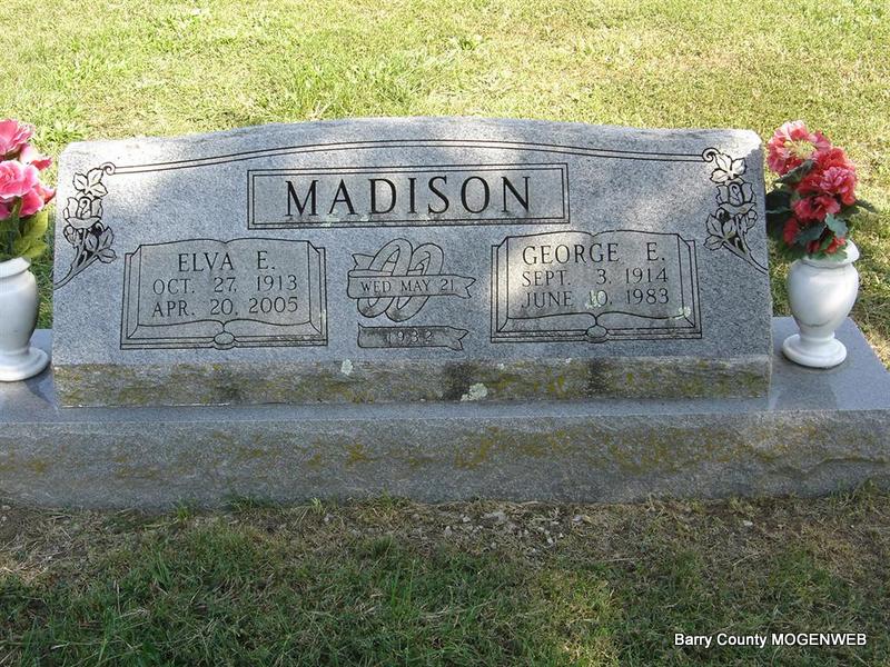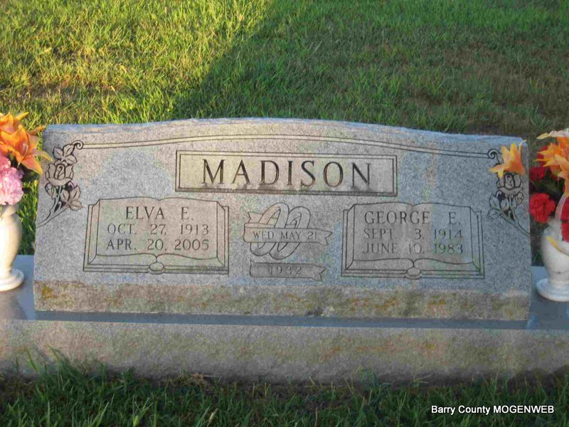 SSW: George E. - Inscription: "Married May 21, 1932" Donna's Note: Clarissa posted Aurora in Barry County, MO, correction was made - Aurora is in Lawrence Co., MO. - Obit: Elva Elizabeth Madison, 91, of Cassville, died April 20 at Aurora Nursing Center. She was born October 27, 1913, in Anadarko, Oklahoma, the daughter of Lee and Gertrude (Shirley) Sturgell. She married George E. Madison on May 21, 1932, and he preceded her in death June 10, 1983. She was preceded in death by one sister, Fadola Hefley; one brother, Marlett Sturgell; one grandchild and one great grandchild. - Another Photo | Headstone Carissa McCracken Photo Elmer Thorn Monett Times Apr. 22, 2005 Donna Cooper Photo Ted Roller |
