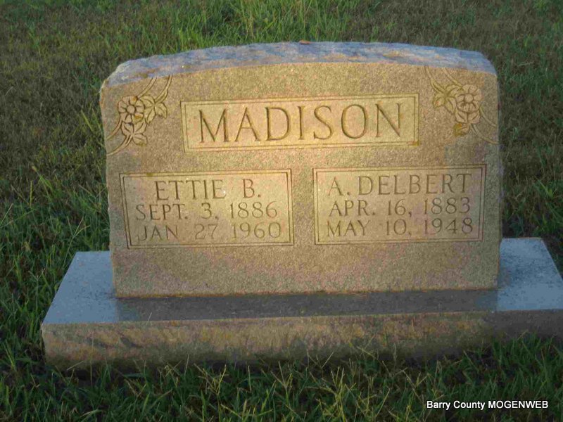 SSW: Ettie B. - Research Note: His death certificate gives his name as Adelbert William. His father's name was given as Levi Madison and his mother as Ida Sherwood. Etta B. Madison was given as his wife's name. His usual address was Cassville, MO. - Another Photo | Death Certificate Donna Cooper Photo Elmer Thorn Photo Ted Roller |