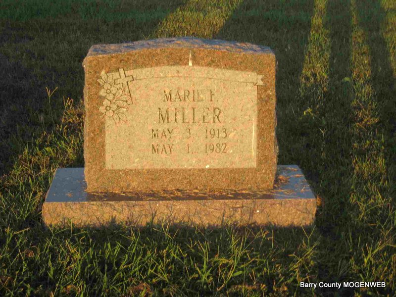 | MILLER, Marie F. (ELBERT) | May 3, 1913 | May 1, 1982 | Research Note: Daughter of Andrew John Elbert and Rosa Ella Patton, buried at Oak Ridge Cemetery. Her husband was Carl Fred Miller. | Census Phyllis Long Photo Elmer Thorn |