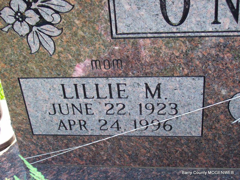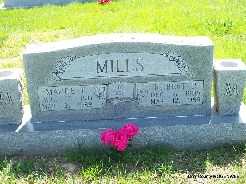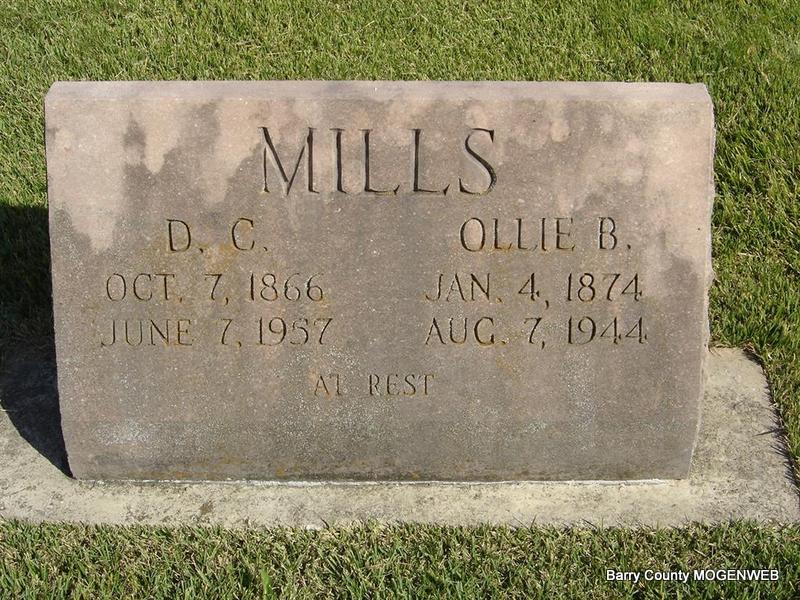 SSW: Ollie B - Research Note: He was a farmer, widowed, age 90. He was a son of Alfred and Lydia (Morgan) Mills. Clara M. Mills of Cassville, MO was the informant. - June 5, 1913, Thursday, Cassville Republican - Oak Ridge News: Willie Mills, son of Dave Mills, who has been in Omaha, Neb., for a few months came home last Thursday. - June 10, 1915, Thursday, Cassville Republican - Cross Hollows: Frank Dilbeck and family and Mrs. Laney and son, Jerry, and others spent Sunday with Dave Mills and family. - January 13, 1916, Thursday, Cassville Republican - Oak Ridge News: Dave Mills and family visited Mrs. Mills' mother of Hungry Hollow, Mrs. Griffith. She is quite sick with lagrippe. - Cassville Republican, Thursday, Dec. 19, 1918 - Oak Ridge: Dave Mills has heard from both of his boys since peace was made. So has Mrs. Brooks heard from Oscar. - Brother's Obit - Sister's Obit - Another Photo | Headstone Annetta Mills Cooper Death Certificate Online Newspapers Phyllis Long Photo Darla Marbut Photo Ted Roller |