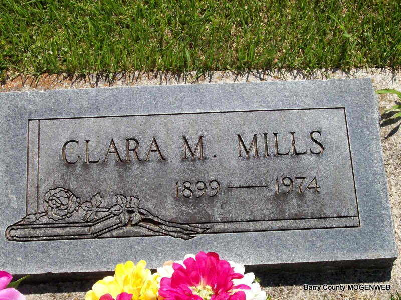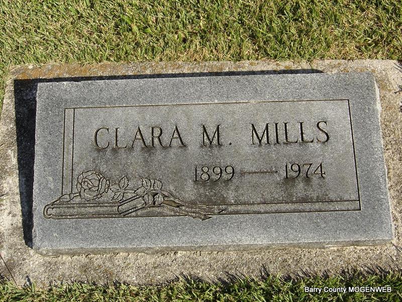 Research Note: She was a daughter of David Clark and Ollie Belle (Ward) Mills. She was single on the 1930 census. - 1910 Census Mineral, Barry, Missouri: Name: Clarrie Mills, Age in 1910: 10, Estimated birth year: abt 1900, Birthplace: Missouri, Relation to Head of House: Daughter, Father's Name: David C, Father's Birth Place: Iowa, Mother's Name: Ollie B, Mother's Birth Place: Missouri, Home in 1910: Mineral, Barry, Missouri, Marital Status: Single, Race: White, Gender: Female, David C Mills 43, Ollie B Mills 36, William A Mills 17, Levi M Mills 16, David C Mills Jr. 14 (Thomas Clark), Clarrie Mills 10, Lewis Mills 5, Robert Mills 1 6/12 - Another Photo | Census Notes Phyllis Long Headstone Annetta Mills Cooper Photo Darla Marbut Photo Ted Roller |
