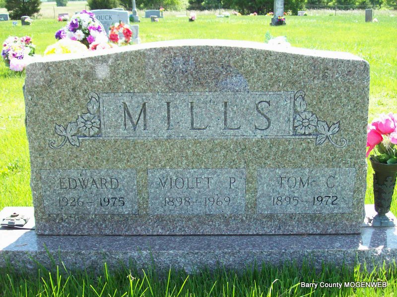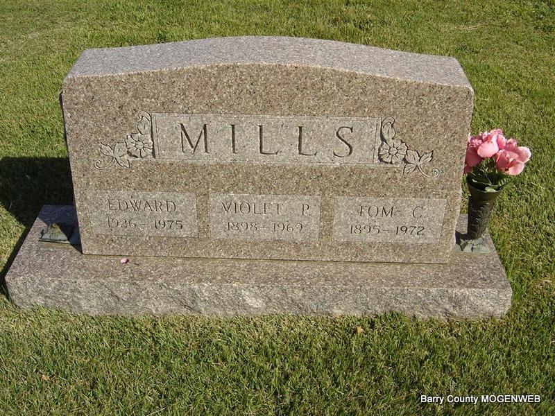 SSW: Violet P. and Edward - Research Note: He was the husband of Violet Pearl Reynolds and a son of David Clark and Ollie Belle (Ward) Mills. Culver's Funeral home reported his father was David Clark Mills and his mother was Ollie Belle Ward, and his son as Thomas Edward Mills of Mt. Vernon, MO. He was a retired telegrapher. 1930 census, he was working on the oil pipe line in Seminole Co., OK. Annetta reported that he died in Springfield, MO, but Culver's records read that he died in Joplin House Nursing Home, and that I. E. Kilbane of 418 Byers, Joplin, MO, was his physician. He was an employee of Sinclair Oil Co., and Walter Pettit, was the administrator of the estate. His home address was Aurora in Lawrence Co., MO. Violet Reynolds was given as his wife's name and he had lived in the community for four years. - April 30, 1914, Thursday, Cassville Republican - Forest Grove News: T. C. Mills of New Mexico and Anna Eden of Cato were married Monday evening at the home of Rev. Ennes. - Cassville Democrat, June 19, 1920 - Anna Mills vs. Thomas C. Mills, divorce. - 1930 Census: Home in 1930: Lincoln, Seminole, Oklahoma, Age: 34, Estimated birth year: abt 1896, Birthplace: Missouri, Relation to Head of House: Head, Spouse's name: Violet P, Race: White, Household Members: Name Age, Tom Clark Mills 34, Violet P Mills 34, Thomas E Mills 3 - Another Photo | Headstone Annetta Mills Cooper Photo Darla Marbut Culver's Funeral Home, V.15, P. 41, by Ted Roller Donna Cooper Online Newspapers Notes Census Phyllis Long Photo Ted Roller |