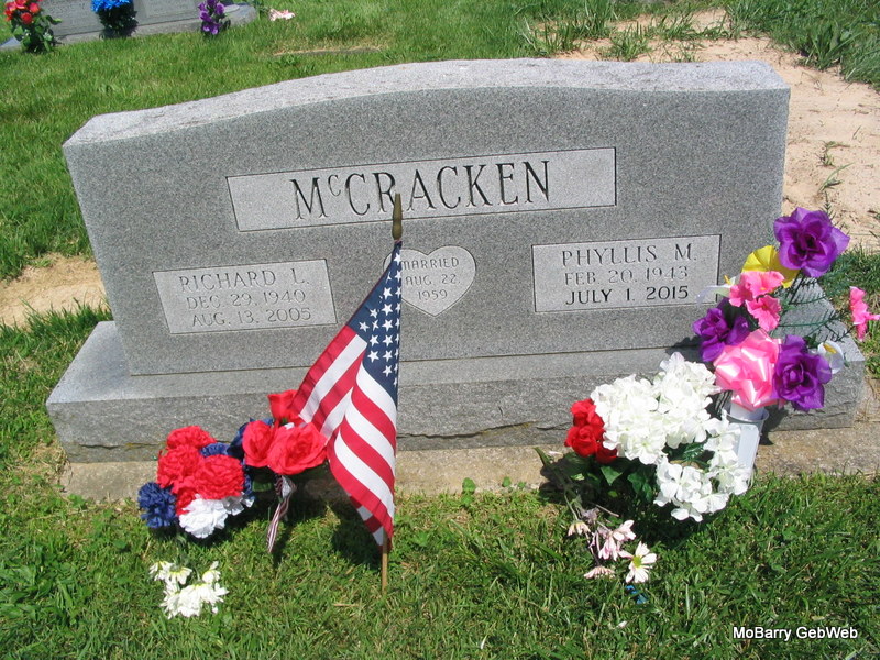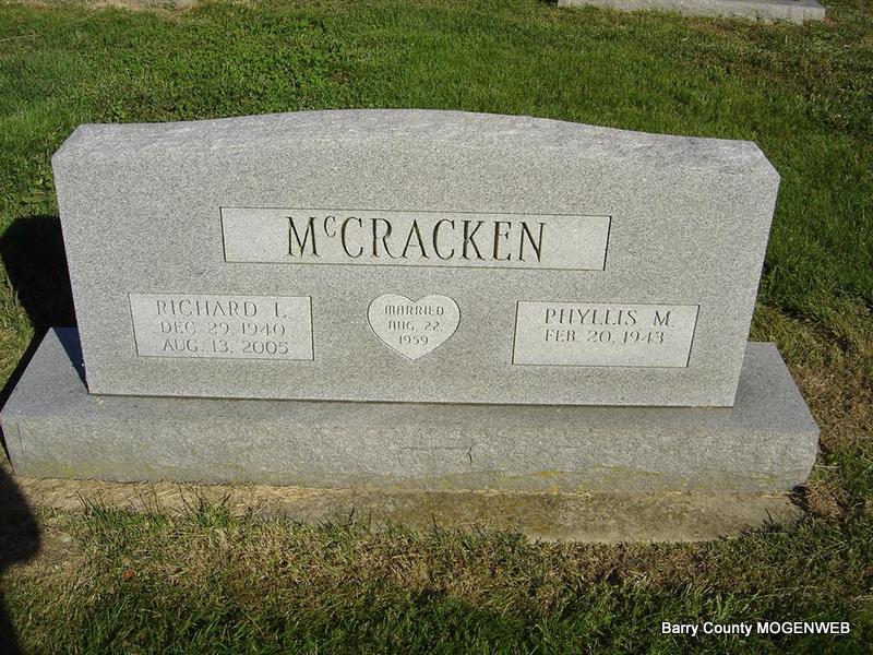 SSW: Phyllis M. - Inscription: "Married Aug. 22, 1959" - Research Note: Richard was a son of Lee Roy and Louise (Harader) McCracken. On Aug. 22, 1959, in Cassville, he was united to Phyllis Sanders. Richard was a 1959 graduate of Wheaton High School. He served in the United States Army and was wounded in Vietnam in Aug. 1968. He was a resident of Barry County most of his life. Survivors include: two sons, three brothers, five sisters, three grandchildren and one step-granddaughter. He was preceded in death by his parents; one son, Jerry Dean; and one sister, Mary Ann. - Another Photo | Photo Ted Roller Notes Monett Times Photo Phyllis Long |