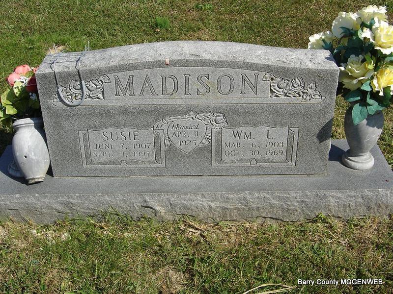 | MADISON, Susie (LUNEY) | June 7, 1907 Jenkins, Barry Co., MO |