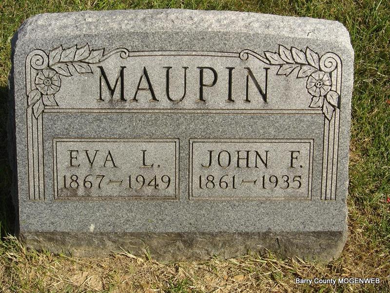 SSW: John F. - Research Note: Her death certificate reads that Cyrus Hayward and Mary O'Dell were her parents. John F. Maupin was given as her husband's name. Apoplexy and hypertension were given as the causes of death. Frankie Hankins, Cassville, MO, was the informant. Phyllis' Note - A slice from her online obit reads: Mrs. Eva Leona Maupin, widow of the late John F. Maupin, passed away in Cassville Wednesday, Jan 26. Mrs. Maupin had suffered a stroke first on January 13th. It is believed that it was a second stroke that resulted in her death. Eva Leona Hayward, was born Nov. 9, 1867 at Carlinville, IL. She was united in marriage to John J. Maupin Nov. 12, 1885. To this union three children were born, two of whom preceded her in death. Surviving is her daughter, Mrs. Frankie Hankins. Mr. Maupin passed away in 1935. Cassville Democrat | Cassville Democrat Online Obit Phyllis Long Death Certificate Donna Cooper Photo Ted Roller |