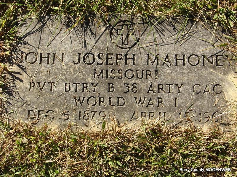 SSW: Timothy - Research Note: Son of John Mahoney and Margaret Connelly. He was a brother of Timothy Mahoney. Gladys M. Brown of Minneapolis, MN, niece, ordered his military stone. - Military Stone - Inscription: "MISSOURI PVT BTRY B 38 ARTY CAC - WORLD WAR I" | Census SS Claims Index Headstone App. Phyllis Long Photos Ted Roller |
