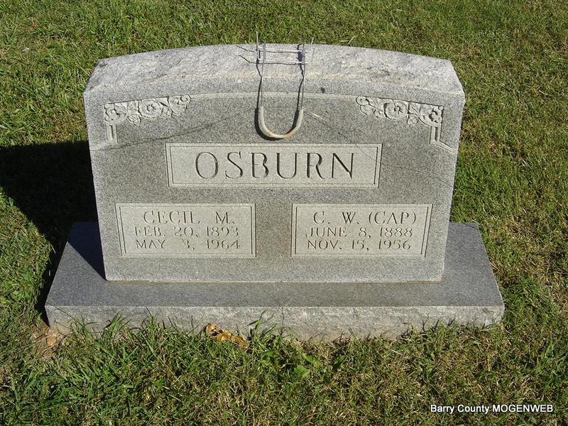 SSW: C. W. "Cap" - Research Note: Daughter of George F. Overman and Ida L. Beeman. Culver's Funeral Home reported that Cecil Margaret Osburn's address was Brazoria, TX, at the time of her death. She was age 71. Her husband was given as Clarence W. "Cap" Osburn, deceased. Her closest relative was Mrs. Margaret Luney (daughter), Cassville, MO, and Charles VanZandt preached her funeral. | Culver's Funeral Home, V. 11, P. 26, by Ted Roller Donna Cooper SS Claims Index Phyllis Long Photo Ted Roller |