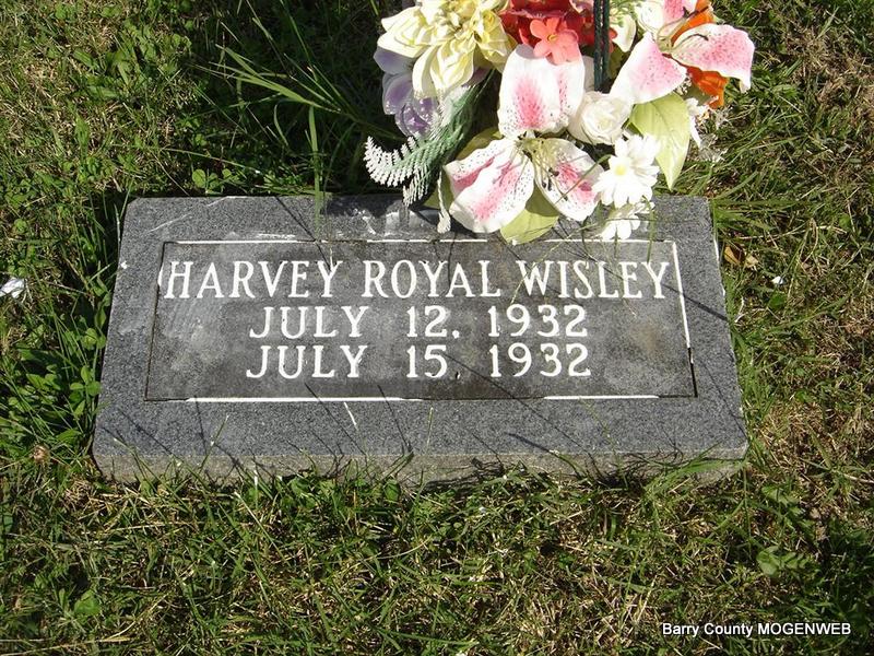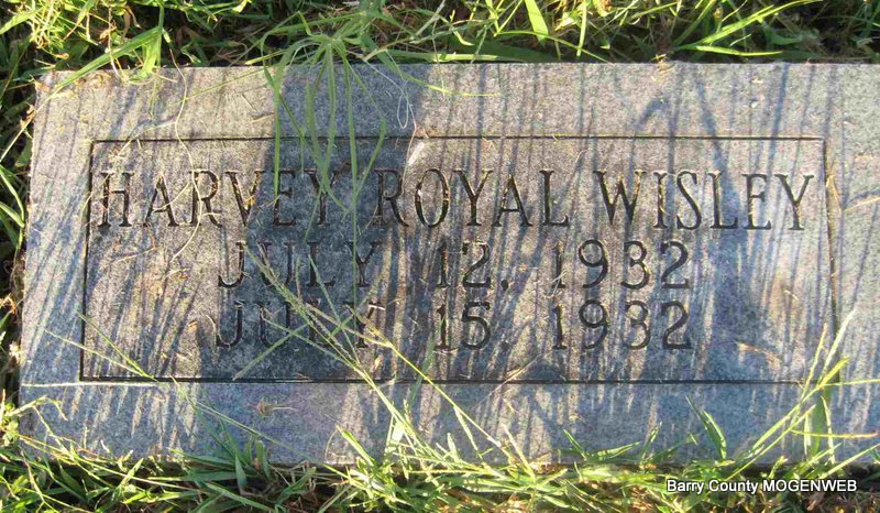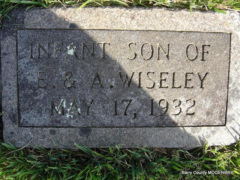 Research Note: His death certificate reads that his father was Leonard Harvey Wiseley and that his mother was Bertha Patton, both born in Barry County. It reads that he was 2 days old and that he died on July 14, 1932. He was buried on July 15, 1932. L. H. Wiseley gave the information. - Another Photo | Death Certificate Donna Cooper Photo Elmer Thorn Photo Ted Roller |