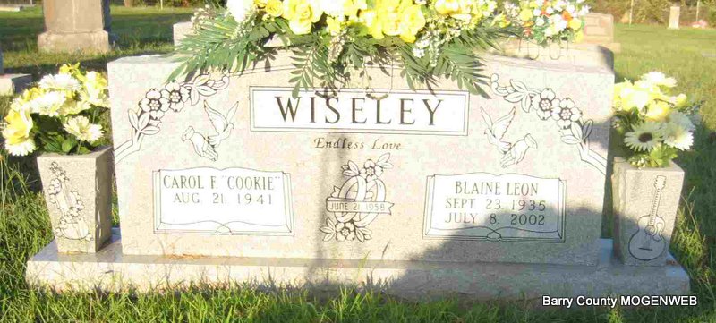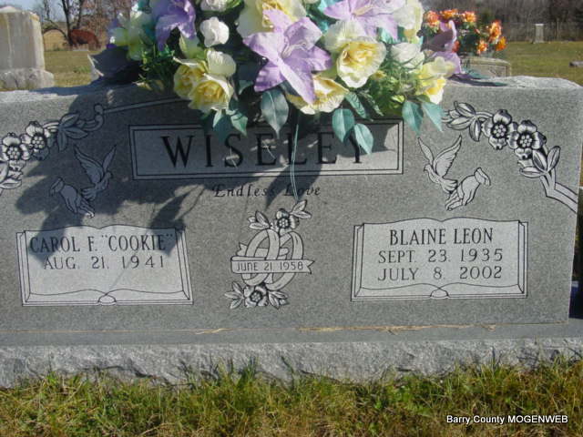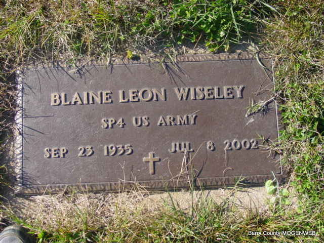 SSW: Carol F. "Cookie" - Inscription: "Married June 21, 1958" - Research Note: He was age 66 years old when he died. He was a son of Leonard H. and Bertha Anna (Patton) Wiseley. On June 21, 1958 in Cape Fair he married Carol Faye Williams. Blaine served in the United States Army from July 1, 1958 through June 21, 1960. He took basic training at Ft. Riley, KS then he was sent to Germany in Jan. 1959. He was there for almost 18 months. Blaine received his education in Cassville, where he graduated from high school. During his early years he farmed. He then was employed w/George's Poultry Plant for several years, retiring there as a Refrigeration Supervisor. - Another Photo - Back of Stone - Military Stone - Inscription: "SP 4 US ARMY" | Monett Times July 11, 2002 Mary Homesley Note Phyllis Long Photo Elmer Thorn Photos Ted Roller |