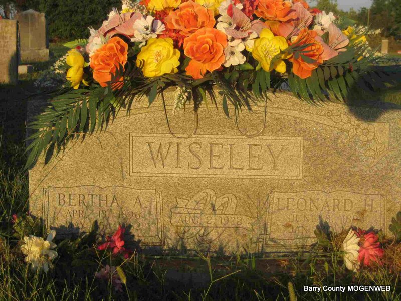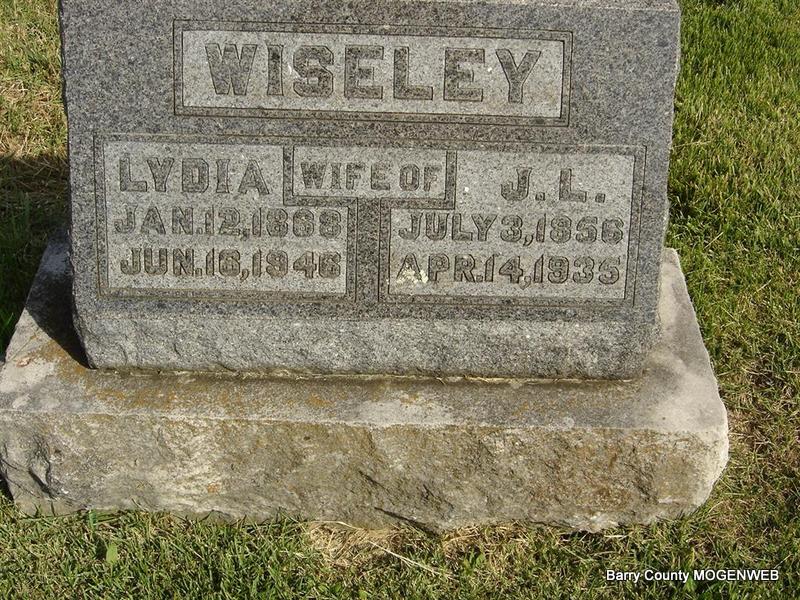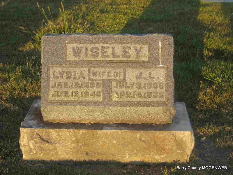 SSW: James Leonard - Inscription: "Wife of J. L." - Research Note: Her father's name was given as Alfred Mills and her mother as Lydia Morgan, both born in Iowa, on her death certificate. - Cassville Democrat, June 1946 - Lydia Ann Mills, daughter of Alfred and Lydia Mills, was born January 12, 1868, near Des Moines, IA and departed this life June 16, 1946, at the age of 78 years, 5 months and 4 days. She was married December 26, 1888 to James Wiseley who preceded her in death, on April 14, 1935. She leaves to mourn her passing eight children; Jess, Roe, Leonard and Melvin of Cassville; Elbert and Arthur of Tulsa, OK; Nora Shores of Cassville and Mabel Hemphill of Jasper; also one step-daughter, Bertha Brown of Butterfield, and one sister, Mrs. Clara Gregory of Kansas City, MO and one brother Dave Mills of Cassville, and 17 grandchildren, besides a host of friends. She was a follower of the Quaker faith and lived her religion every day. She was always a dependable help in time of need and enjoyed her friends very much. She will be sadly missed by her children and all who knew her. Funeral services were held at Oak Ridge Monday afternoon by Rev. Frank Reynolds. Burial was in the church cemetery under direction of the Culver Funeral Home. - Another Photo | Death Certificate Donna Cooper Photo Elmer Thorn Photo Ted Roller |