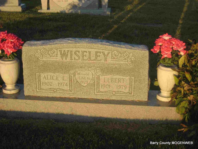 | WISELEY, Elbert George | May 21, 1901 | Dec. 24, 1979 | SSW: Alice Esther - Inscription: "Married June 16, 1923" - Research Note: Son of James Leonard Wiseley and Lydia Ann Mills. - Another Photo - Another Stone | Census Phyllis Long Photo Elmer Thorn Photos Ted Roller |