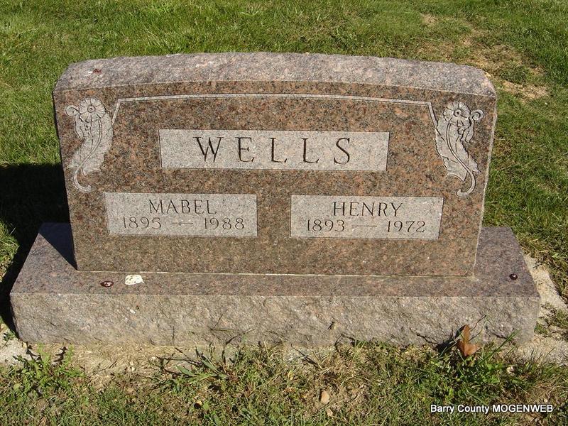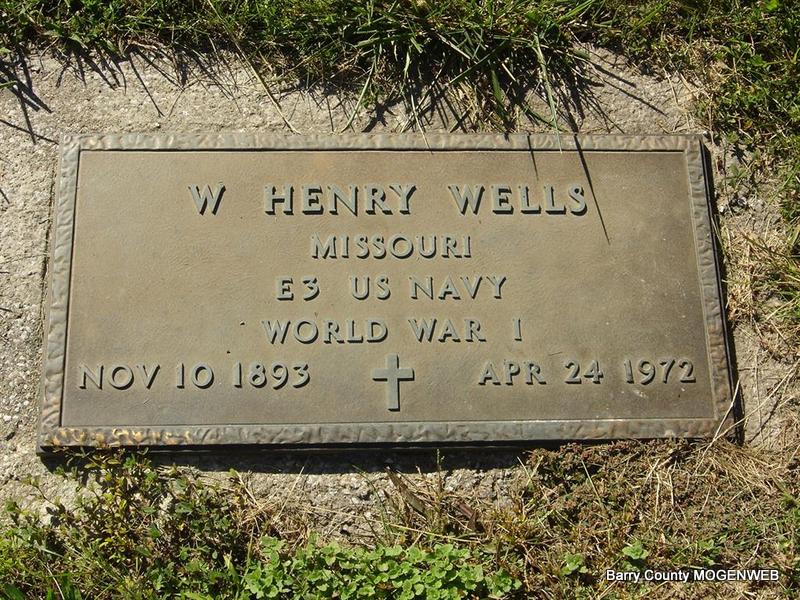SSW: Mabel - Research Note: Culver's Funeral Home records read that William Henry Wells was a son of Elisha Wells and Julia Ann Day. He was a stockmen and a farmer. His address was Rt. 1, Cassville, MO, and he had lived in the community 14 years. His stone just has Henry on it. - Military Stone - Inscription: "MISSOURI E3 - US NAVY - WORLD WAR I | Culver's Funeral Home, V. 15, P. 19, by Ted Roller Photos Ted Roller |