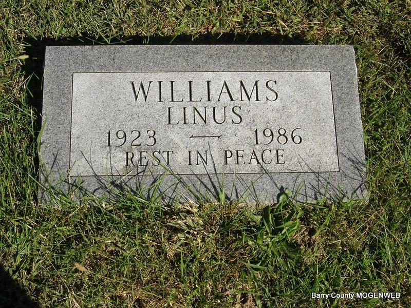 | WILLIAMS, Linus | 1923 | 1986 | Research Note: He was a son of Charles and Susan (Foster) (Williams) Joiner and his Social Security Card had his last address as Exeter, MO, in Barry County. | Photo Ted Roller SSDI Census Phyllis Long |