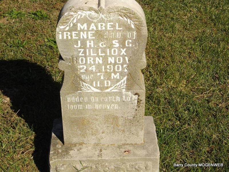 | ZILLIOX, Mabel Irene | Nov. 24, 1907 | July 5, 1908 | Inscription: "Age 7 M. and 11 D." - Research Note: She was a daughter of John Henry Zilliox, born PA, and his wife, Sarah Gertrude Gilmore, born MO. Buried at Oak Hill Cemetery. | Photo Ted Roller Note Phyllis Long |