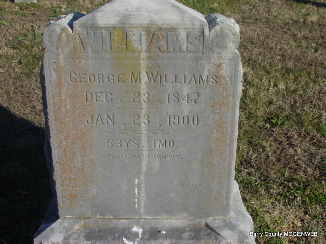 | WILLIAMS, George M. | Dec. 23, 1847 | Jan. 23, 1900 | Inscription: "53 YRS. 1 MO." - Research Note: 1880 Census, his wife is Lucy, age 24. | Census Phyllis Long Photo Ted Roller |