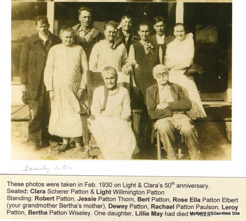 Patton, Clara (Scherer) Patton, Light Willmington Patton, Robert Thorn, Jessie (Patton) Patton, Bert Elbert, Rose Ella (Patton) Patton, Dewey Paulson, Rachael (Patton) Patton, Leroy Wiseley, Bertha (Patton) Patton, Lillie May Submitted in 2007 by Anne Alice Allen |