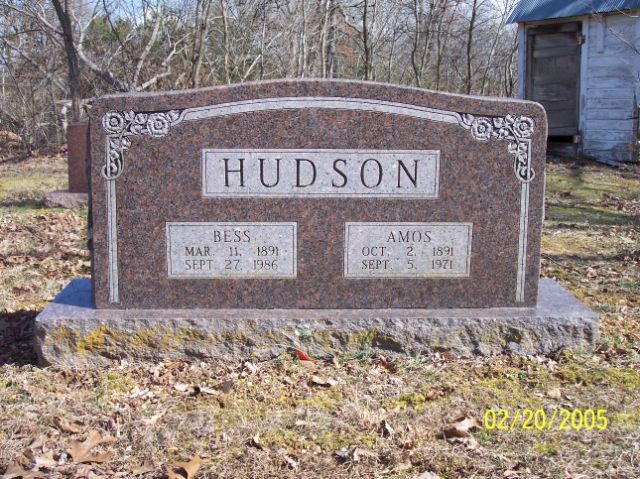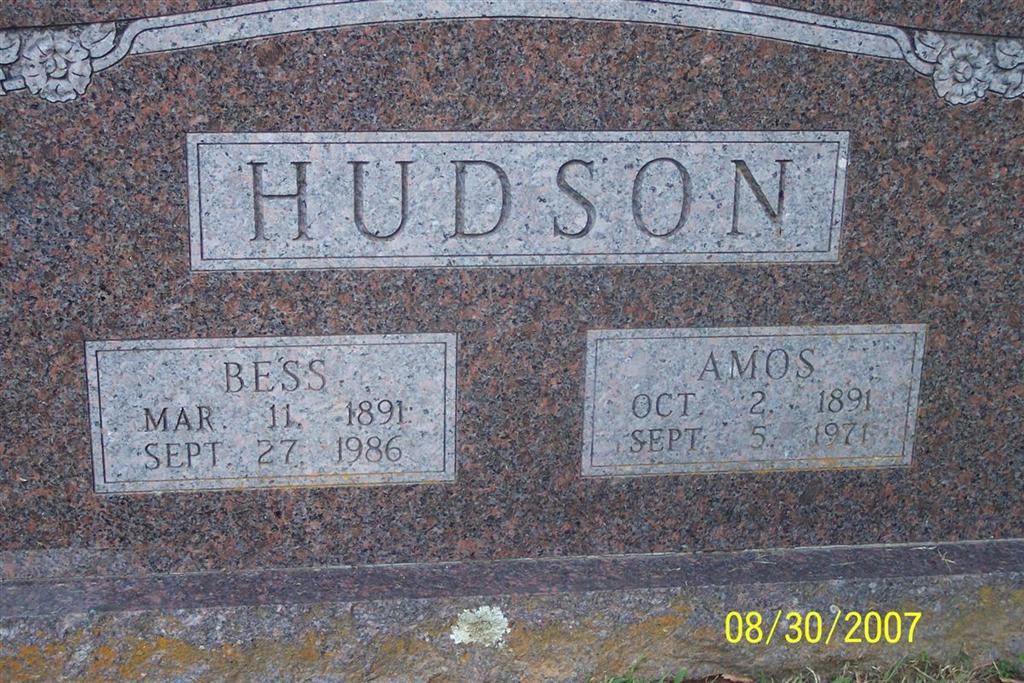 SSW: Bess - Research Note: Son of George Alexander Hudson and Rebecca Jane Doty. Rural Jenkins, Barry Co., MO resident. - April 4, 1912, Cassville Republican - Circuit Court Proceedings: State vs. Frank Hudson and Amos Hudson, rescuing prisoner, dismissed by state. - September 17, 1914, Cassville Republican - Flat Creek News: Mr. and Mrs. Frank Hudson of near Cato spent Sunday night with his brother, Amos Hudson, and wife. - Cassville Republican, Sept. 8, 1971 - AMOS HUDSON - Funeral services for Amos Hudson, 79, of Jenkins, were held Wednesday in the Clio Community Building with Clarence Pearce officiating. Burial was in Old Carney Cemetery under direction of Manlove of Crane. Mr. Hudson, a retired farmer, died Sunday night in the Aurora Community Hospital. He is survived by his wife, Bess; one son, Lon, of Jenkins; two daughters, Mrs. Lucille Williams, Sacramento, Calif., and Mrs. Vennie Turner, of La Brey, Calif.; two sisters, Mrs. Chloe Blankenship, Jenkins, Mrs. Amy Blythe, Cassville; one brother, Frank, of Jenkins; and 14 grandchildren and 21 great-grandchildren. - Another Photo | Online Newspapers Obit Census Death Certificate Phyllis Long Photo Diana Cope |