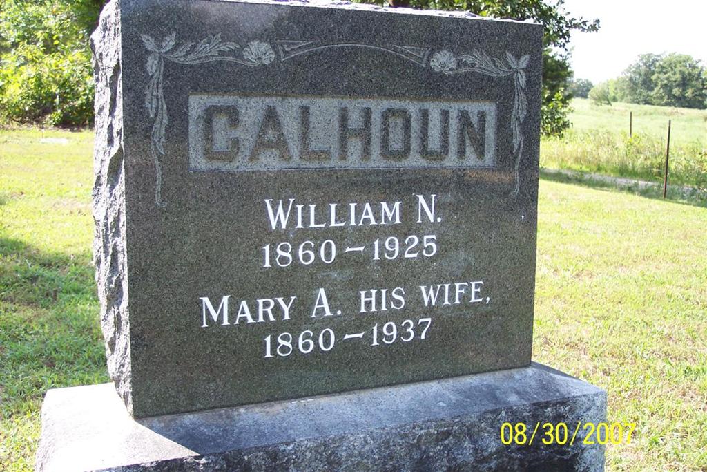 SSW: William N. - Inscription: "His Wife" - Research Note: Cassville Republican, Aug. 20, 1937 - Mary A. King, wife of W. N. Calhoun, was born January 26, 1861 and died August 17, 1937, age 76 years, 6 months and 22 days. Eight children was born to this union, who are A. C. Calhoun, Aurora; W. E. Calhoun, Cape Fair; B. C. Calhoun, Aurora; V. C. Calhoun, Cape Fair; Mrs. Cora Wilson, Albuquerque, N. Mex.; J. H. Calhoun, Boise Idaho; W. N. Calhoun, preceded her in death June 12, 1925; also 2 children, Finis and Opal, died at an early age. Mamie as her husband liked to call her, was a calm and gracious lady about the home. Funeral services were held at the Pleasant Valley Baptist Church, on Thursday afternoon, Aug. 19, 1937, by Chas. Vanzandt, Mrs. Carrie Williams, and Mrs. Lula Edmondson, Clinton Blythe, and Truman Thompson rendered vocal selections, with Miss Lavonna Hill at the organ. | Death Certificate Online Obit Phyllis Long Photo Diana Cope |