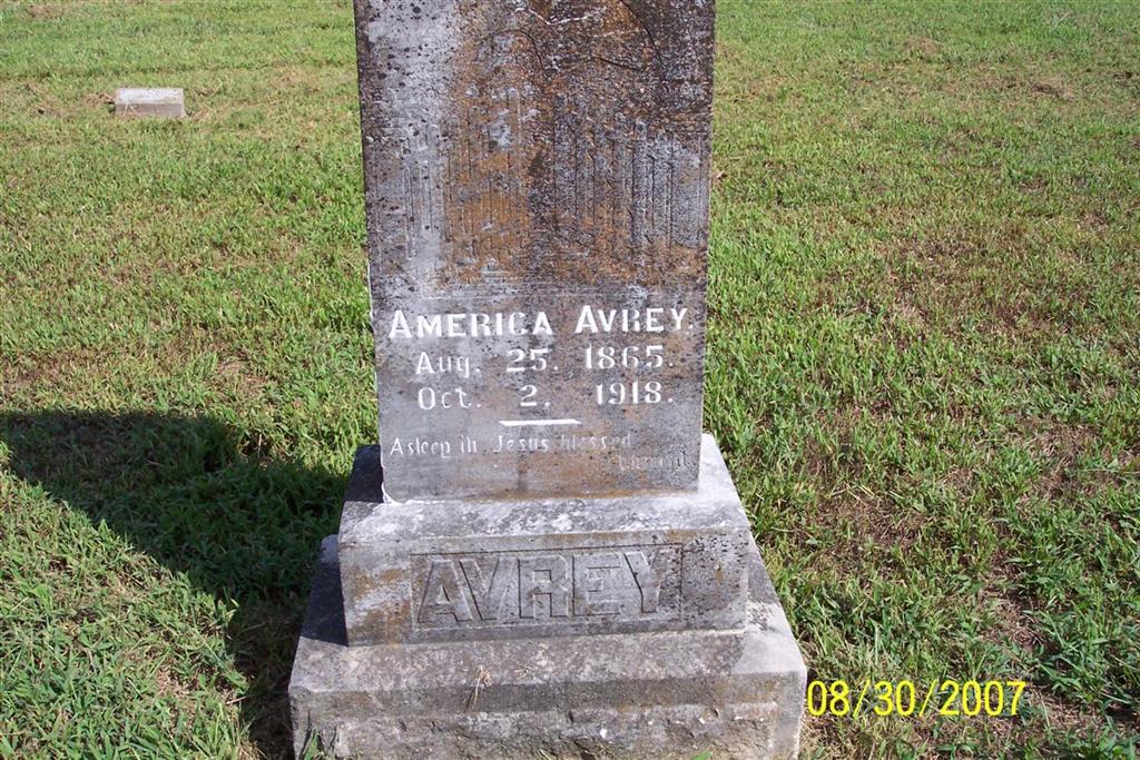Research Note: Her death certificate reads that her father was Abner Cantrell, born in TN and her mother's name was Tela, born in TN. Henry Avrey of Cape Fair, MO, gave the information. - Rile Avrey, head, born July 1873 TN, age 26, married 5 years, father born NC, mother TN; America, wife, born Aug. 1865 TN, age 34, married 5 years, parents born TN. - Census points to her being the daughter of Eliab/Abner Cantrell and Artelia Redmon. | Death Certificate Donna Cooper Census Phyllis Long Photo Diana Cope |