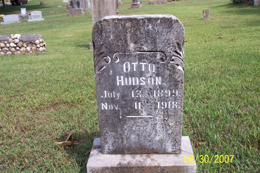 | HUDSON, Otto | July 13, 1899 | Nov. 11, 1918 | Research Note: Genealogy of the John Brown "Grub" Hudson: Otto Hudson, the youngest son of Thomas Calvin and Mattie Elizabeth Hudson, was born on July 13, 1899, in the community of Flat Creek, Missouri (Barry County). During World War 1, Otto was working for the shipyards in Norfolk, Virginia, when he became ill with the flu. He started home by train and was found unconscious in the Crane, Missouri, railroad passenger depot. He was taken to the home of a friend and died on November 11, 1918. He was buried at Carney Cemetery in the Community of Flat Creek, Missouri (Barry County). | Hudson Genealogy Erv and Patty Hudson Photo Diana Cope |
