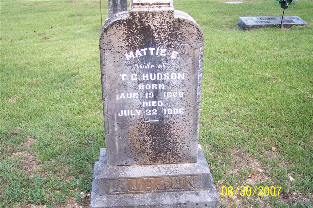 | HUDSON, "Mattie" Martha Elizabeth (SUMMERS) | Aug. 19, 1866 | July 22, 1906 | Inscription: "Wife of T. C. Hudson" - Research Note: Thomas Calvin Hudson married Mattie E. Summers on Aug. 23, 1885 in Stone Co., MO. Daughter of Price Summers and Martha Stone. | MO Marriage Records Census Phyllis Long Photo Diana Cope |