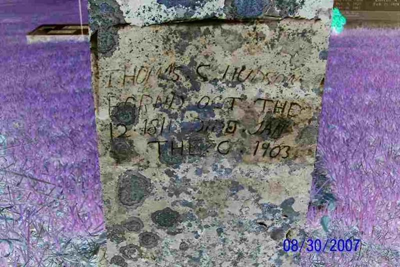 Inscription: "Thomas C. Hudson - Bornd Oct. the 12th 1811 Died Jan. the 20th 1903." - Research Note: Thomas Croucher Hudson was born on October 12, 1811 in Allen, Kentucky to John Ballard and Agnes (Croucher) Hudson. As a young man Thomas moved with the family from Kentucky between 1818 and 1822 and they settled on Crooked Creek near Georges Creek west of Yellville, Arkansas (along with sisters Lucinda, Nancy and Mary J.). The location would later become known as the Uncle Joe Burleson Place. His brother Jesse (b. 1803) would soon join the family and built a blacksmith shop. In 1836 when Arkansas was admitted to the Union, Thomas' father, John B. Hudson, was elected the first treasurer of Marion County and served as such until 1842. Thomas first married Betty Young with no known children born to the union. His second marriage to Elizabeth Perryman bore five children. John B. Hudson (Grub), Margaret (Peggie), Isaac Wilson, Thomas, and Allen William. Thomas cleared land, cultivated crops and lived in a cabin on what was later known as the Fate Davenport Place. He hunted the area along with friends John Tabor and Frank Hudson for bear and deer. In the 1850's Thomas moved to Barry County, Missouri where he is listed as being a wagon maker and creator of early pioneer products such as spinning wheels, etc. Thomas passed away on Jan. 20, 1903. He is buried in the Old Carney Cemetery in Jenkins, Barry County, Missouri with a hand carved stone which was made by his son, Isaac Wilson Hudson. - Computer Enhanced Negative | Hudson Genealogy Erv and Patty Hudson Photo Diana Cope |