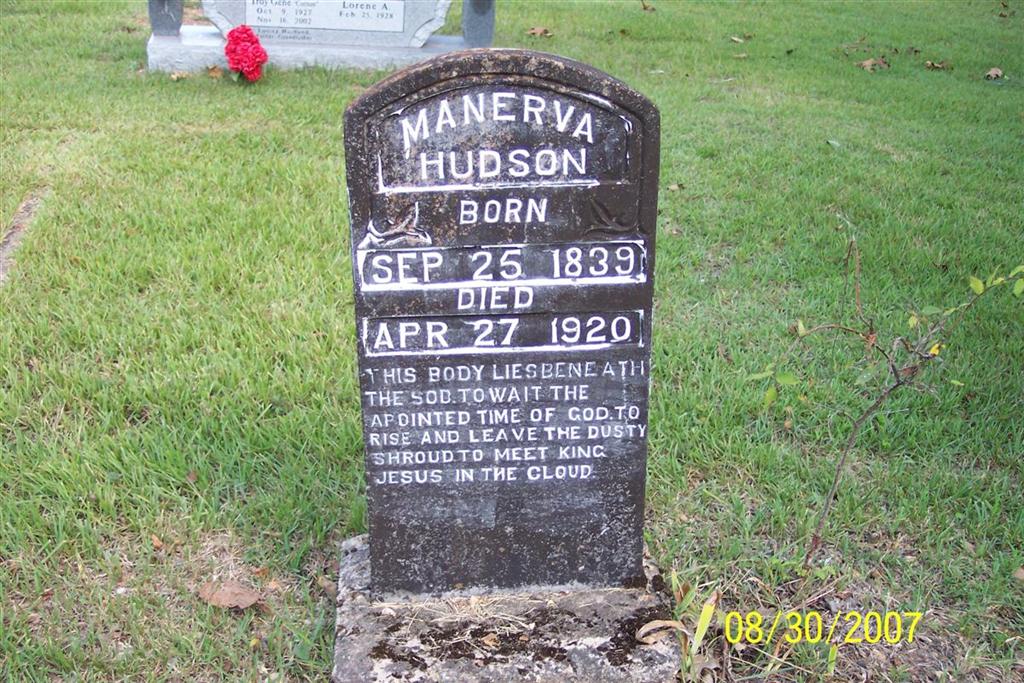 Research Note: John Brown Hudson was her husband's name. They married July 28, 1859, Barry County, MO. She was listed in 1850 Barry Co., MO, as age 10 in the home of Calvin and Clarissa Carney. - Cassville Democrat, May 1, 1920 - Mrs. Minerva Hudson of near Flat Creek, p. o. died April 26. She was a sister of G. G. and Henry Carney of that section and was among the oldest residents of that section. Daughter of Calvin Carney and Clarissa Hill. | Online Newspapers Census Phyllis Long Photo Diana Cope |