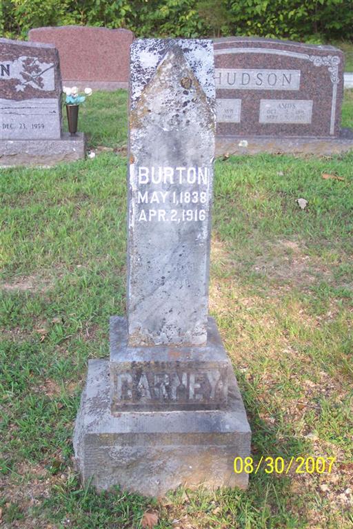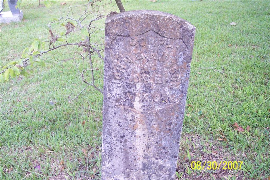 Inscription: "CORPL. JOHN B. HUDSON CO. E 1 ARK. CAV." - Research Note: King Funeral Home Records record the death of John Brown Hudson as Sep. 29, 1917 - age 79 years at death. Jay's Note: Funeral Home Record lists no cemetery, but Shirley Chang submitted to RootsWeb that he was buried in Carney Cemetery. His death certificate reads that he was buried on Flat Creek and gives his date of death as Sept. 31, 1917 and his father as Thomas C. Hudson, and his mother was given as Elizabeth Perriman, both born in TN. - Genealogy of the John Brown "Grub" Hudson Family: John Brown Hudson, the oldest son of Elizabeth Perryman and Thomas Croucher Hudson. He married Minerva Carney on Jul 28, 1859. Seven children are known to have been born to this union: Thomas Calvin, Clarice Elizabeth, John David, Isaac Jacob, Tennessee, Samuel, and Mariah Ann. Samuel and Tennessee died while young children in Texas. At the start of the Civil War, John Brown Hudson enlisted in the AR Cavalry, served the entire war. He took part in many minor engagements and a few real battles. He was noted in his company as a joker, always careless about his equipment. Anything that would hold together was good enough for him and many times he had no bridle for his horse. At Fayetteville, AR 1862, his company was ordered to take the town from the Confederate force. As usual, when orders came, Hudson could not find his bridle, so he rigged up one by taking a cast of headstall - making a bit out of a piece of rope. He was ready when the command was given to "fall in". When they had come close to the town, a charge was ordered. The company went full speed into the town to find it occupied by a larger force than had been reported. The commanding officer ordered a halt but Hudson's horse had chewed his bit in two so he was running at full speed into the camp. Therefore, he was captured. When camp was pitched that night, he entertained his captors with funny stories and queer antics until there were convinced he was crazy so they gave him his freedom on the promise not to fight against them further. The promise held good until he made it back to his company. How he acquired the name Grub Hudson: Being a fiddler, he quite naturally took to all the dances held in the vicinity of the soldiers camp. It is reported that he, and others of his company, slipped away without permission to attend a neighborhood dance. As soon as their absence was noted, a non-commissioned officer was sent to look for them. The officer found them at a dance w/Hudson playing the fiddle. The officer secured the names of the others, who gave their correct names. Then he asked Hudson's name. As chance for a joke, Hudson gave the name of John Grub, another guy of the company, who was sleeping in the camp. As a result, Grub was called on the carpet, while Hudson went his way, tormenting others. After the war, he settled in Carroll County, AR, for a time before returning to Barry County, MO. He was residing on Carney Branch, when he lost his foot by catching it under a tree that he had felled. Being over a mile from home at the time, he amputated his own foot. - Cassville Democrat, October 13, 1917 - John Hudson of near Flat Creek, P. O., died Sept. 29, aged 79 years. The Crane Chronicle says he was a civil war veteran and served in the 1st Ark. Cavalry. He left a wife and five children. Rev. Davis Coones conducted funeral services and the remains were interred in the Carney Cemetery. - Another Photo | Death Certificate Donna Cooper Note Jay Trace Hudson Genealogy Erv and Patty Hudson Online Obit Phyllis Long Photo Diana Cope |