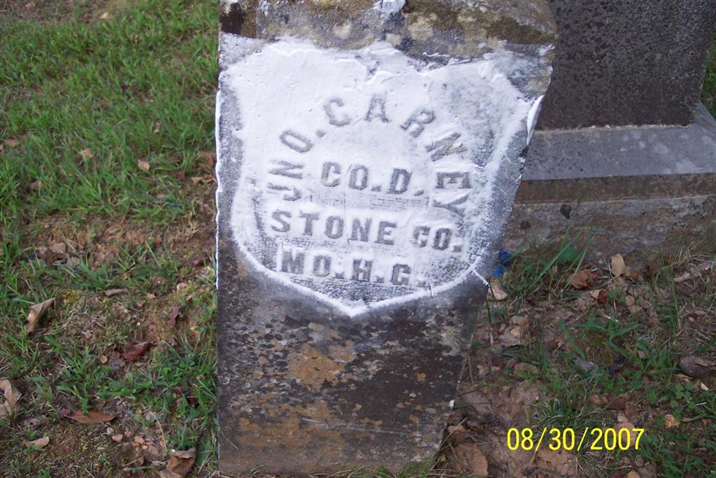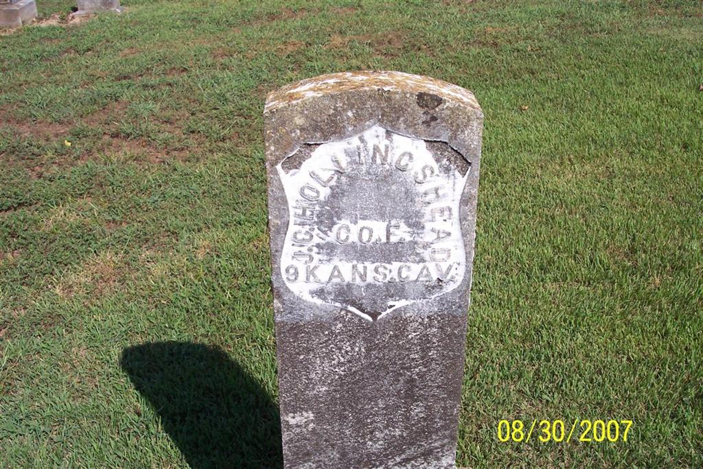 Inscription: "CO F 9 KANS. CAV." - Research Note: His death certificate is indexed as John Holinghead on the MO Archives Web Site. The place of his burial on death certificate is given as Flat Creek Cemetery. He has a stone at Carney. He was married and a farmer. Son of Gield? Hollingshead, born OH. Mother not listed. Will Hollingshead of Monett, MO was the informant. - January 29, 1914, Cassville Republican - John Hollingshead died Friday night at the home of his son-in-law, J. H. Purdom, of near Cato of paralysis, age 78 years. He had been a resident of Barry County for a number of years. He is survived by a wife and seven children. Internment was made Sunday afternoon at the Carney Cemetery. - Son of John Bowen Hollingshead and Elizabeth Persinger. He married Eliza J. Hale on Nov. 8, 1866 in Franklin Co., KS. He was a Civil War Veteran, private, 9th Kansas Cav. He filed for his pension on Nov. 14, 1881 from Kansas. His wife, Eliza J., filed for his pension on Mar. 11, 1914 from MO. - Notes of Jean Ann at ancestry.com: SEARCHING FOR MY GREAT-GRANDPARENTS - My search began for my Great-grandparents almost 40 years ago, when my Mother gave me a old yellowed letter, still in the envelope addressed to my Grandma Flora Mae Hollingshead telling her about family, in the late 1940's or early 1950's. If gave John Christopher Hollingshead's birth about 1835 in Ohio with wife name Eliza Jane, and sisters and one brother Will Spencer. My Grandmother had died by the time I was given the letter, but Mother remembered another brother from an earlier marriage. When we moved to Owasso, Ok, 30 years ago, that tiny town had a Mormon Genealogy Library. Starting in the middle 1980's I began to spend many hours in their back room going through census, through marriage records, etc. There was also another Genealogy Library in Tulsa, OK., near us, that had books and records (I copied what seemed like a million facts about the family). Not only was I able to find John Christopher, but I began to find other members of the family, but in finding Eliza Jane--I continued to hit brick walls. In the late 1990's my husband and I went to Garnett, Kansas, their genealogy library was fantastic. Now only did I find books that told much about the Hollingsheads, but the whole story began to unfold. John Christopher Hollingshead was the 2nd son born to John Bowen and Elizabeth (Persinger) Hollingshead on 1 July 1835 in Sidney, Shelby County, Ohio. John Bowen and Elizabeth (Persinger) Hollingshead and their four youngest children Priscilla Ann, Margaret E., John C., and Richard S. left Miami, Logan County, Ohio, after 1850 and headed toward Fayette County Iowa. Their older son William Persinger Hollingshead and wife Isabelle Swallow, daughter of Levi Swallow, with their small children accompanied them. Sometime before 1855 John C. married Margaret Swallow, younger sister to Isabelle Swallow Hollingshead. Their first and only child Abram Boquilla Hollingshead was born about 1855 in Linn, Linn County, Iowa and his Mother died shortly thereafter in 1856. Almost immediately John C., and older brother William P. and Isabelle (Swallow) Hollingshead leave Iowa and head west to Kansas Territory. Both brothers are excellent blacksmiths. By about 1858 John C., has married again, a woman by the name of Amanda Cass, who dies in childbirth. In 1860 John C., and Abram B., are living with William P. and Isabelle Hollingshead and family in Centerville, Linn County, Kansas. The Civil War is beginning and Abram B. is left with his Aunt and Uncle, and John C., goes to fight for our country. He enters the war 18 Nov. 1863 in Leavenworth, Kansas, in company F. In the field, he is promoted to head blacksmith 16 Jan. 1865. When he is sent home, he almost immediately re-enlists, this time in DeVall's Bluff, Arkansas, his rank was FBS, in Company 2-C. Not long after the war is finally over, he meets his third wife, (my Great-grandmother) Eliza Jane Hale, daughter of Henry Hale. But it will be many years before I am able to find any information about Eliza Jane Hale. John C., and Eliza Jane Hale marry 8 Nov. 1866 in Franklin County, Kansas. A daughter Sarah is born about 1868 in Ottawa, Franklin County, Kansas and is listed in the 1870 census, but most likely died as a young child. In the 1880 census she is not listed. Then Margaret Belle, E. Julia, Flora Mae, (my Grandmother), William Spencer, Edna Ida, and Edith Viola were born in and around Garnett, Anderson County, Kansas. By the time John C. got out of the military, William P. had moved on to Garnett, Anderson, KS where he had started a saw mill and established his family there. The two men went into business and William P. stayed in Garnett. John C., now also a master craftsman, would take his family and go into different counties around the Garnett area and build a beautiful victorian home with wood and supplies from the Garnett homebase. After he sold a house or two, he and the family would again move to another area and repeat the same thing over and over. Many lovey victorian houses through out Anderson County, Kansas were built by John C., with wood and supplies coming from William P.'s business in Garnett. By 1910 John C. and Eliza Jane had moved to McDonald County, Mo. John C. died 22 Jan. 1914 and Eliza Jane died aft 1920 buried in the Carney Cemetery near Flat Creek, Barry County, Missouri. Eliza may be buried in Kearney, Clay County, Missouri, according to other researchers. - Another Photo | Death Certificate Online Newspapers Civil War Records Phyllis Long Family History By Jean Ann Photo Diana Cope |
