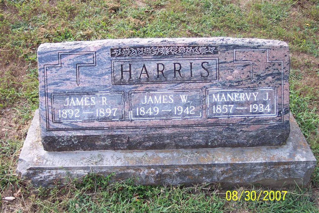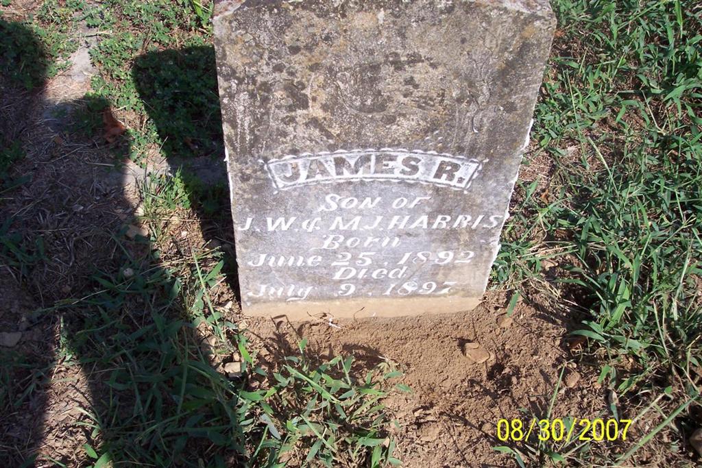 | HARRIS, James R. | June 25, 1892 | July 9, 1897 | SSW: Manervy J. & James W. - Inscription: "Son of J. W. & M. J. Harris" - Research Note: Son of James Washington Harris and Minerva Jane Segraves. - Another Stone | Note Phyllis Long Photos Diana Cope |
