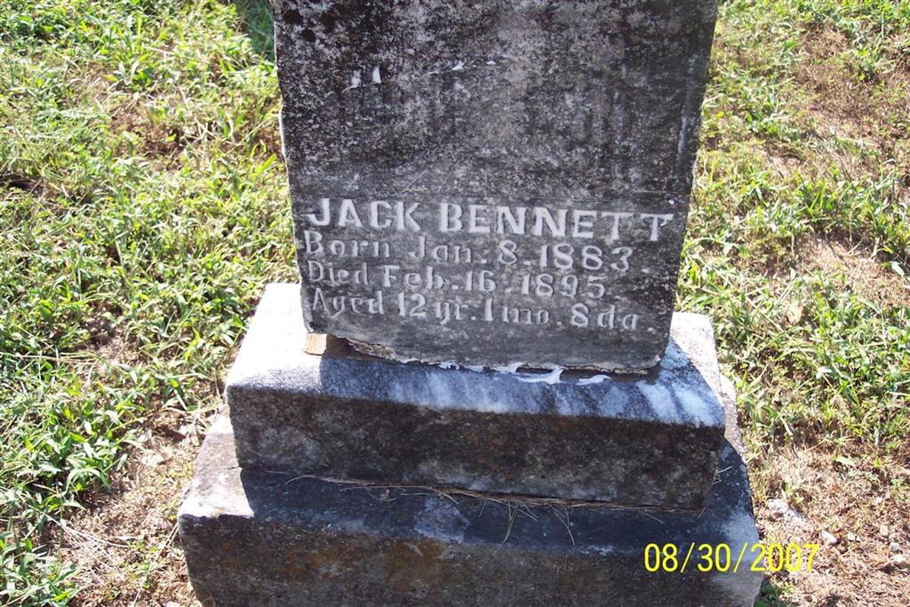 | BENNETT, Jack | Jan. 8, 1883 | Feb. 16, 1895 | Inscription: "Aged 12 Yr. 1 mo. 8 da." - Research Note: Son of John Alec Bennett and Rosa Etta Cookston. | Note Phyllis Long Photo Diana Cope |
