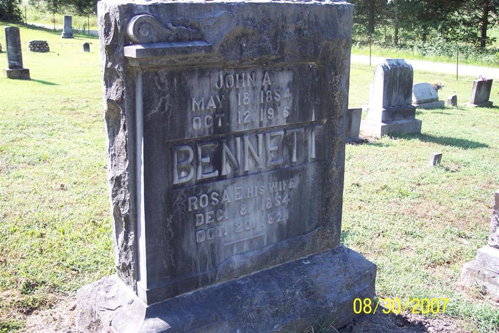 | BENNETT, Rosa Etta (COOKSTON) | Dec. 8, 1854 | Oct. 20, 1921 | SSW: John A. - Inscription: "His Wife" - Research Note: Daughter of John A. Cookston and Melinda Ray. | Census Phyllis Long Photo Diana Cope |