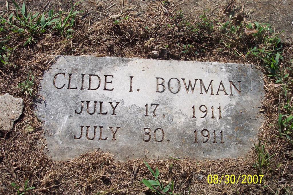 | BOWMAN, Clide I. | July 17, 1911 | July 30, 1911 | Research Note: Probably the son of Sigle Bowman and Mary McCracken. | Note Phyllis Long Photo Diana Cope |