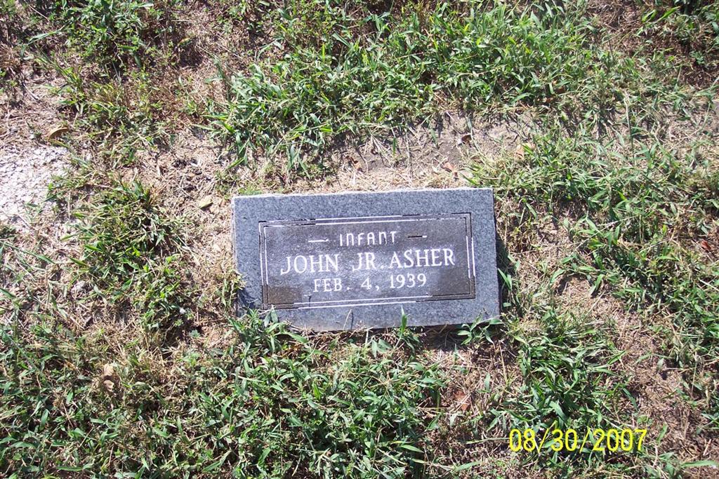 Inscription: "Infant" - Research Note: Stillborn son of John E. Asher born Stone Co., MO and his second wife Blanche Shephard born Barry Co., MO. John Asher, father, of Cape Fair, MO was the informant on the death certificate. | Death Certificate Phyllis Long Photo Diana Cope |