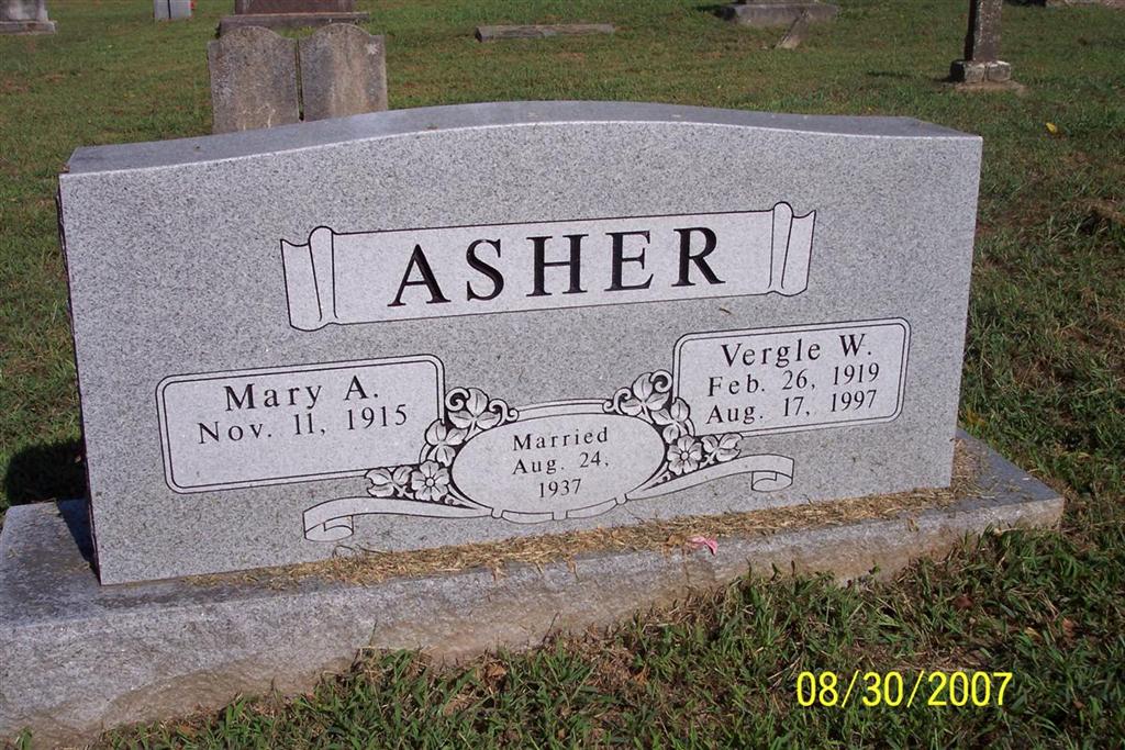 | ASHER, Mary A. | Nov. 11, 1915 | Jan. 15, 2010 | SSW: Vergle - Inscription: "Married Aug. 24, 1937" - Research Note: SSDI gives her last residence as Monett, Barry Co., MO. | SSDI Phyllis Long Photo Diana Cope |