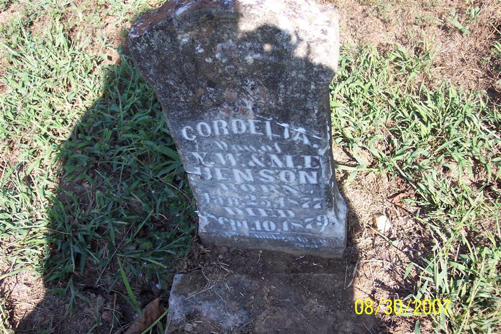 | HENSON, Cordelia | Jan. 25, 1877 | Sept. 10, 1879 | Inscription: "Dau. of Y. W. & M. E. Henson" - Research Note: Daughter of Young Washington Henson and Matilda Elizabeth Hilton. | Note Phyllis Long Photo Diana Cope |
