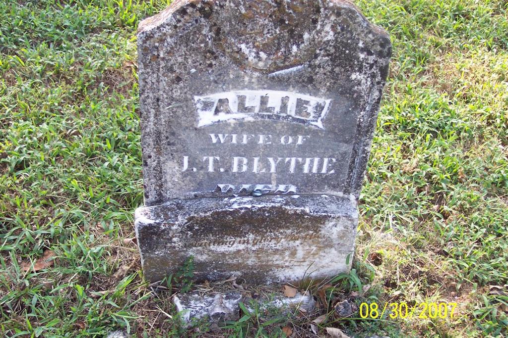 | BLYTHE, Allie (CARNEY) | Aug. 10, 1860 | Aug. 15, 1881 | Inscription: "Wife of J. T. Blythe" - Research Note: This broken stone was repaired but the date is missing. Her parents were John and Sarah Ann (Moore) Carney. She was married to John Blythe before he married Nancy Carney and Bell Zinn. | Note Donna Cooper Photo Diana Cope |