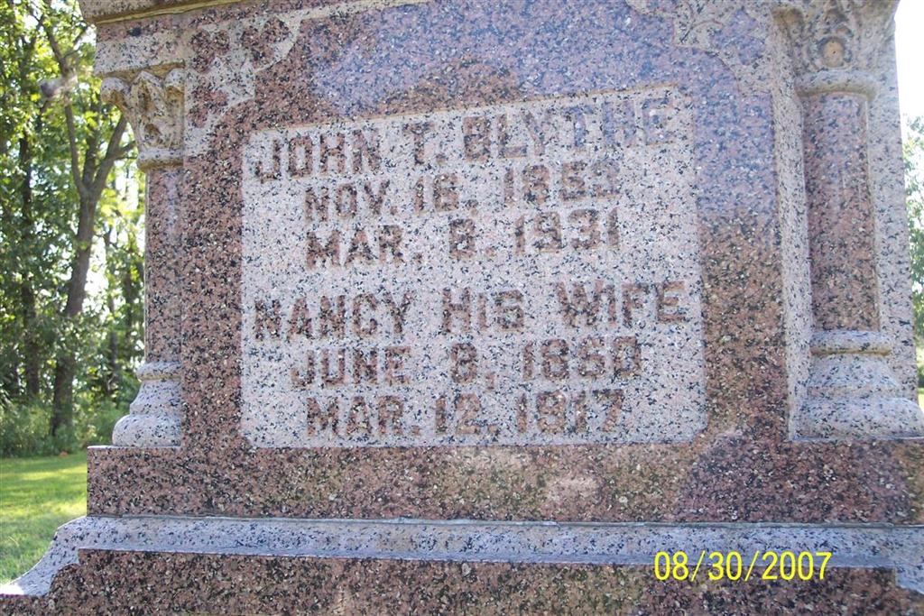 Mar. 8, 1931 | SSW: Nancy - Research Note: Husband of Bell, died of apoplexy. His father was William Blythe, and his mother was Martha Bayless. - Donna's Note - Bell Zinn was one of his wives and he also married Allie Carney Feb. 27, 1881. - Family History by Belva Blythe Easley: John Thomas Blythe was born Nov. 16, 1853 in TN to William J. and Martha (Bayless) Blythe, their third child and second son. John's first wife was Ala (Allie) Carney, the daughter of John and Sarah (Moore) Carney. She was born Aug. 10, 1860. Allie and John were married Feb. 27, 1881 before she died Aug. 15, 1881 without children. John's second wife was Allie's sister, Nancy Carney Moore (having previously been married to George Moore) born June 8, 1850. To this union were born four children: Allie, May 3, 1882; Florence ("Fawn") Sept. 3, 1885; Thomas G. ("Bud") Feb. 1, 1888, and Pearl Oct. 28, 1889. Nancy died Mar. 12, 1917 and is buried in the Carney Cemetery on Flat Creek. John Married Belle Zinn. John was a prominent livestock farmer and served as president of the Jenkins bank several years. He died Mar. 8, 1931 and is buried in the Carney Cemetery. | King Funeral Home Jay Trace Note Donna Cooper Family History Belva Blythe Easley Photo Diana Cope |