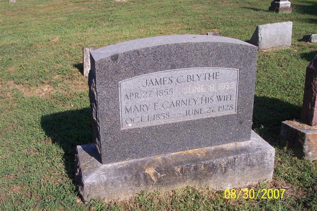 SSW: Mary E. Carney - Research Note: His death certificate names William and Martha (Bayless) Blythe as his parents. He was widowed and a farmer. Mrs. Isaac Epperly of Shell Knob, MO, gave the information. - Family History by Belva Blythe Easley: James Carrick Blythe was born Apr. 29, 1855 in Meigs Co., TN, the third son of William Jefferson and Martha (Bayless) Blythe and moved to Barry Co., MO with his family in 1858. Carrick, as he was called, married Mary Elmira Carney, born Oct. 1, 1859, the daughter of John and Sarah (Moore) Carney, on Nov. 28, 1880. The first child, Hattie, was born Sept. 7, 1881. Second daughter, Allie, was born June 17, 1884 and lived almost 15 months until Sept. 7, 1885. The family probably settled at Shell Knob in Barry Co. in late 1885 or early 1886 for as Hattie's son, Albert, recalls his mother always said she moved to Shell Knob when she was four years old. A warranty deed shows that Carrick and Mary Blythe purchased 80 acres of land there in 1889. A son, William (Willie) was born Jan. 26, 1886; the third daughter, Cordelia (Delia) was born Mar. 14, 1889 and a second son, John Claude, was born Jan. 31, 1894. The third son, Clyde Emmett, was born Dec. 21, 1899 and was joined by two sisters, Blanche Lulu and Zelma born Dec. 28, 1901 and Jan. 15, 1906 respectively. Carrick and Mary Blythe and all of their seven children who lived to be grown men and women, lived their entire lives in Barry Co. with the exception of Clyde (Dr. C. E.) who practiced dentistry in Aurora, MO for 34 years prior to his death Feb. 14, 1960. Mary died June 27, 1928 and Carrick died June 8, 1933. Both are buried in the Carney Cemetery on Flat Creek. | Death Certificate Donna Cooper Family History Belva Blythe Easley Photo Diana Cope |