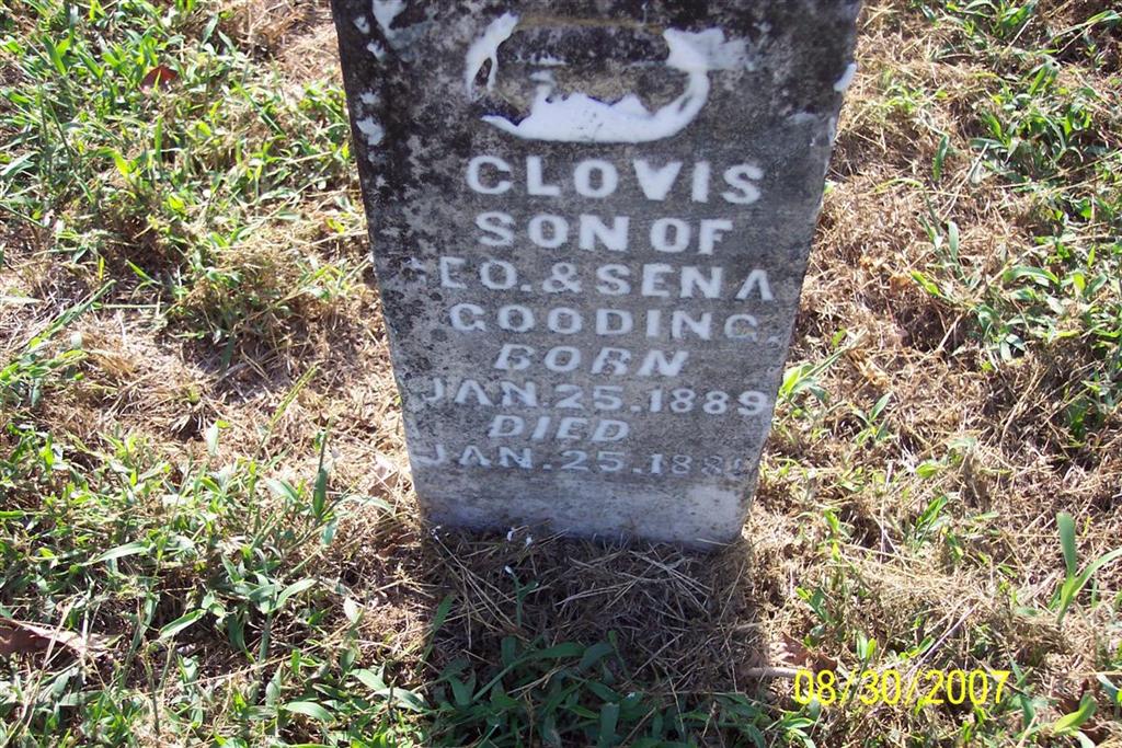 | GOODING, Clovis | Jan. 25, 1889 | Jan. 25, 1889 | Inscription: "Son of Geo. & Sena" | Photo Diana Cope |