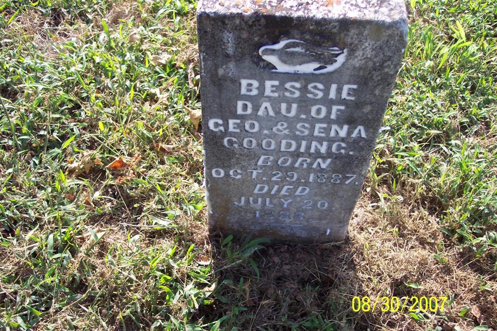 | GOODING, Bessie | Oct. 29, 1887 | July 20, 1888 | Inscription: "Dau. of Geo. & Sena" | Photo Diana Cope |