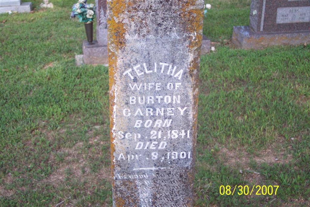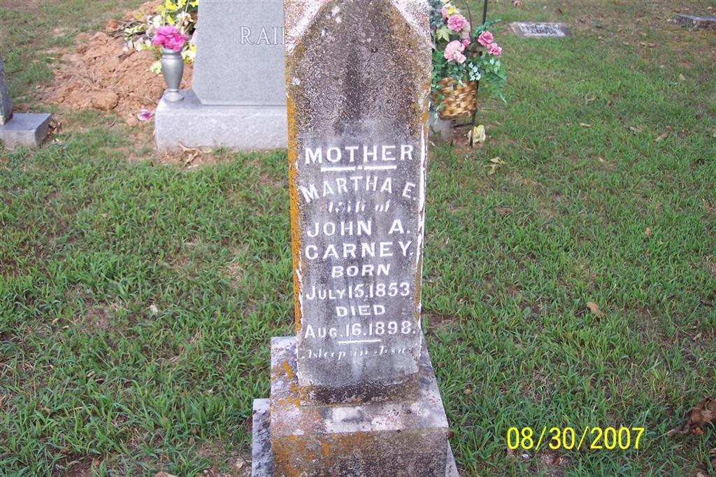 | BLYTHE, Nancy (CARNEY) (MOORE) | June 8, 1850 | Mar. 12, 1917 | SSW: John T. - Inscription: "His Wife" - Research Note: She was a daughter of John and Sarah (Moore) Carney and was married to George Moore before she married John T. Blythe. She married George Moore on Jan. 14, 1866 - date of Feb. 10th is on the record but it isn't the date. She married John T. Blythe on Mar. 7, 1889 in Neosho, Newton Co. MO. - Cassville Republican, March 22, 1917 - Mrs. J. T. Blythe died at her home near Flat Creek post office last Tuesday of heart trouble. Mrs. Blythe was the daughter of Mr. and Mrs. Judge Carney, her father being dead. She was married to J. T. Blythe and is survived by her husband and four children, three daughters and one son. She had been a member of the Baptist Church for many years and she will be greatly missed by her family and many relatives and friends. The remains were interred Wednesday in the Carney Cemetery near the Flat Creek post office. | Note Donna Cooper Online Obit Phyllis Long Photo Diana Cope |
