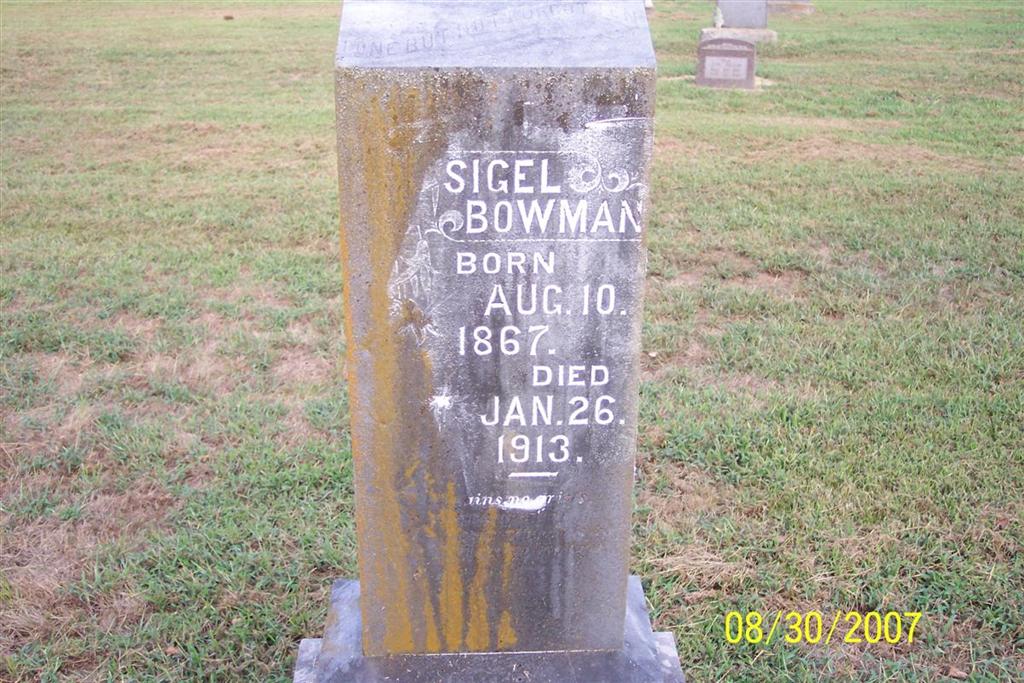 | BOWMAN, Sigel L. | Aug. 10, 1867 | Jan. 26, 1913 | Research Note: Son of Andrew Jackson and Zelicia Bowman. Sigle Bowman married Mary McCracken on Jan. 18, 1891 in Golden, Barry Co., MO. - Cassville Republican, Jan. 30, 1913 - Sigel Bowman, died at his home four miles east of Purdy, Sunday, January 26, of pneumonia. Funeral services were held Monday and interment was made in Carney Cemetery. Mr. Bowman's death is the third in the family inside of two weeks; all having pneumonia. Mr. Bowman's brother-in-law died Thursday, January 16 and his mother-in-law, Mrs. Windham, died Friday night, January 24. Three others of the family connections are very ill with the disease, they being brother-in-law Henry Calhoun and two children of F. E. Shepherd. - 1900 Census, Shell Knob, Barry, Missouri - Seigle Bowman, head, born Aug. 1866 MO, age 33, married 9 years, father born VA, mother AR; Mary, wife, born Sept. 1873 MO, age 26, married 9 years, mother of 2 children, 2 living, father born TN, mother AR; Myrtle, daughter, born Feb. 1892 MO, age 8; Gertrude, daughter, born Sept. 1893 MO, age 6; Andrew J., father, born May 1832 VA, father born VA, mother NC; Lawrence, brother, born Apr. 1877 MO, age 23, single, father born VA, mother AR. | Note Donna Cooper Online Obit MO Marriage Records Census Phyllis Long Photo Diana Cope |