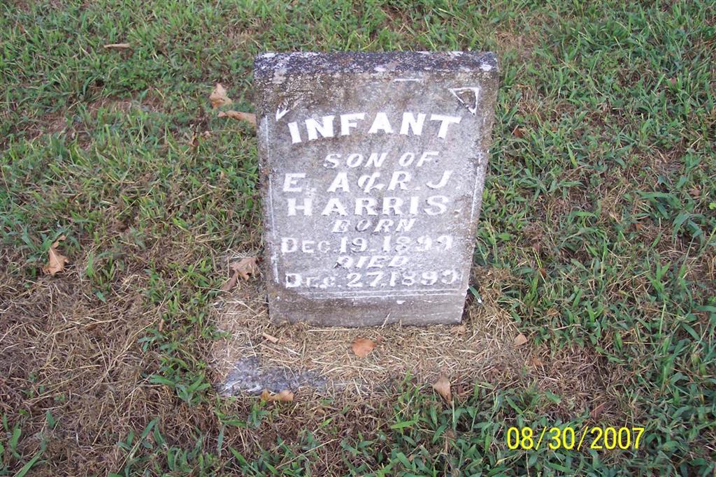 | HARRIS, Infant | Dec. 19, 1899 | Dec. 27, 1899 | Inscription: "Infant Son of E. A. & R. J." | Photo Diana Cope |