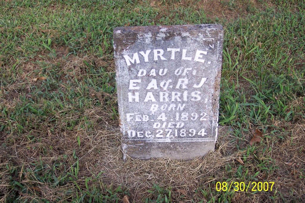 | HARRIS, Myrtle | Feb. 4, 1892 | Dec. 27, 1894 | Inscription: "Infant Dau. of E. A. & R. J." | Photo Diana Cope |