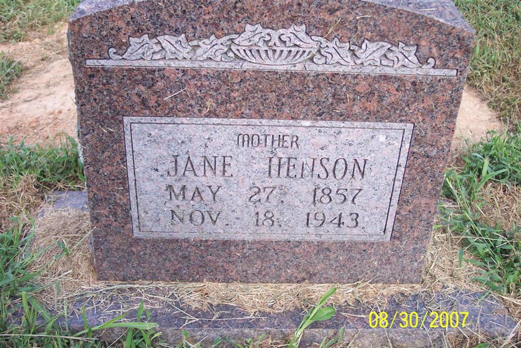 Inscription: "Mother" - Research Note: Her husband's name was Francis Marion Henson and he died in 1912. She was the daughter of Enos H. and Martha (Stone) Baker. Roy Henson, (son) of Adair, OK, was the informant on the death certificate. | Note Donna Cooper Death Certificate Phyllis Long Photo Diana Cope |